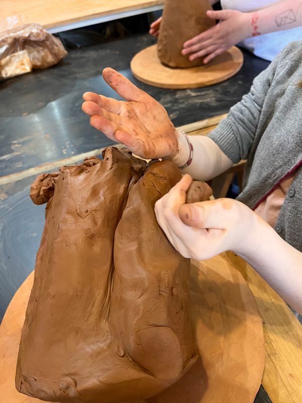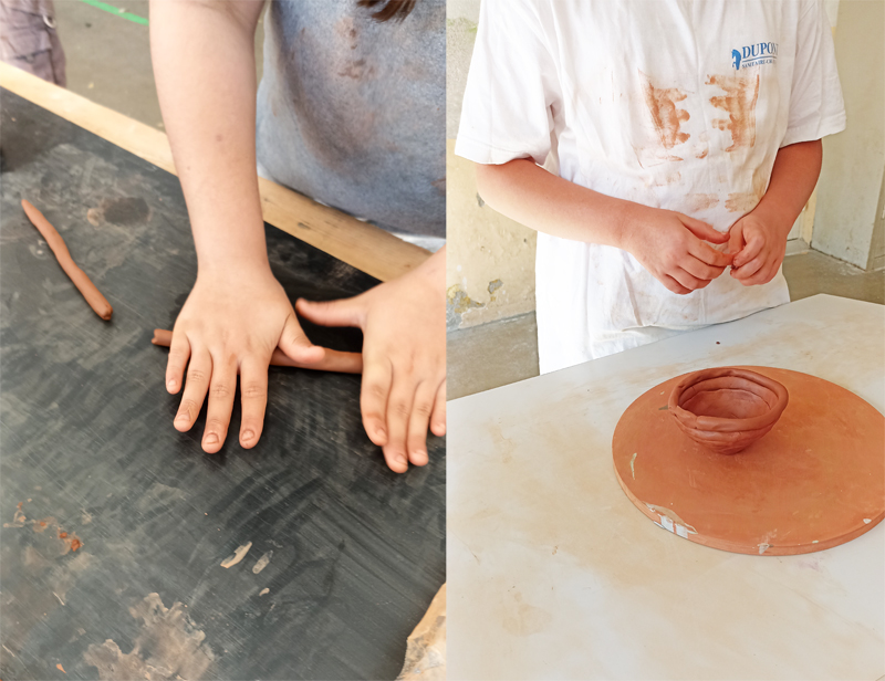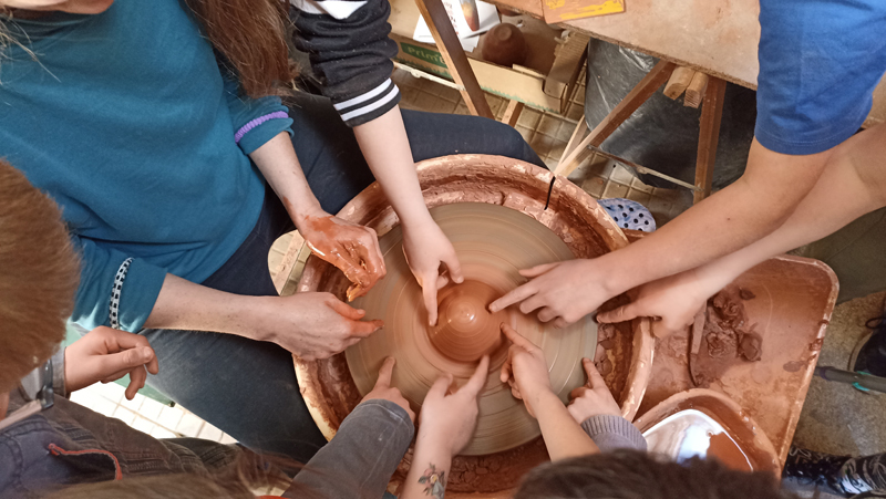 Le céramiste les a accueillis dans son atelier de La Rochebeaucourt et Argentine. Ils ont pu y découvrir le matériel, les matières mais aussi assister à une démonstration de tournage. Cette visite a aussi été l’occasion de mettre les mains dans la terre pour la première fois : ils ont créés des bustes originaux en grande dimension. Loïc les a également amenés dans une grotte dans laquelle ils ont pu récolter de la terre qu’ils ont par la suite laissé décanter. Enfin le céramiste est venu dans leur classe et les a guidés pour façonner leur propre bol au colombin. Un bol qui a été cuit et qu’ils ont pu garder. Un carnet dédié à la technique de la céramique a accompagné et nourri le projet tout au long de l’année.