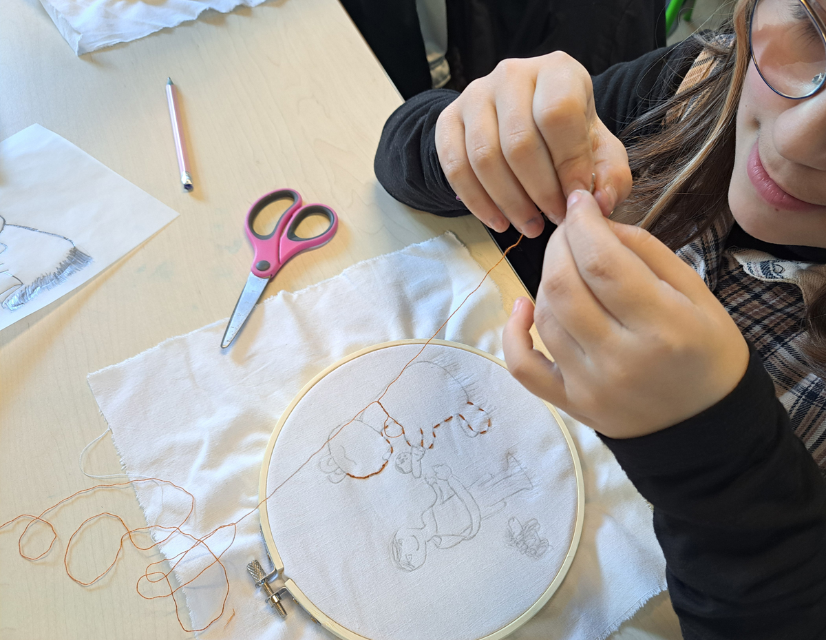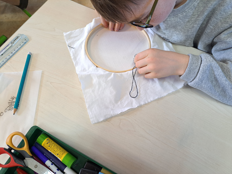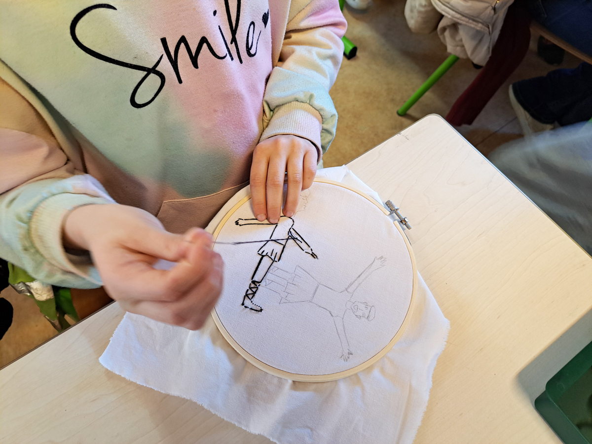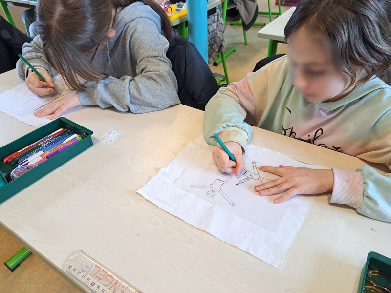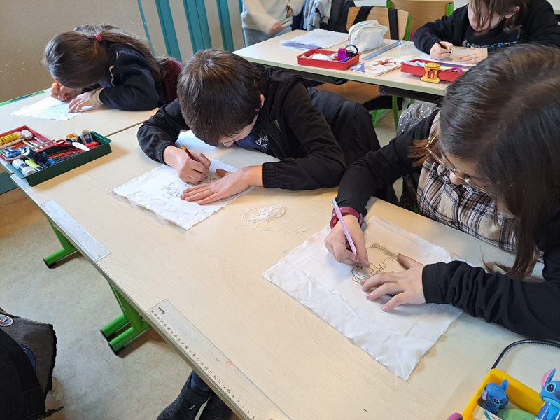 Nous avons réalisé nos dessins, puis nous les avons décalqués sur des carrés de tissus. Nous les avons ensuite brodés et cousus ensemble afin de réaliser le rouleau.