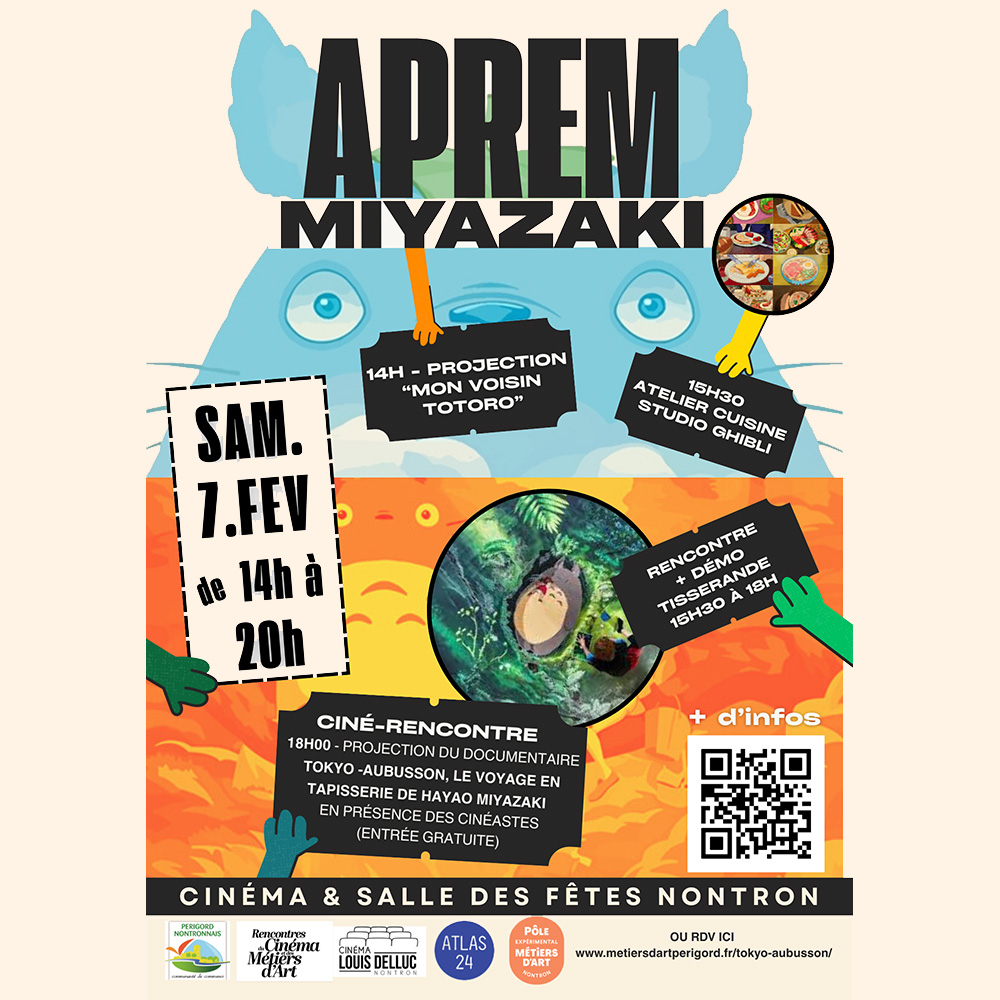 Le Pôle Expérimental des Métiers d’Art, le Cinéma Louis-Delluc et Atlas 24 organise un après-midi autour du film documentaire « Tokyo-Aubusson, le voyage en tapisserie de Hayao Miyazaki ». Nous proposons une programmation mêlant cinéma d’animation et film documentaire, métiers d’art et atelier cuisine, autour du documentaire en forme de récit sensible et onirique de la création à Aubusson, de 5 tapisseries monumentales inspirées d’images de films emblématiques du plus grand cinéaste d’animation japonais : Hayao Miyazaki.